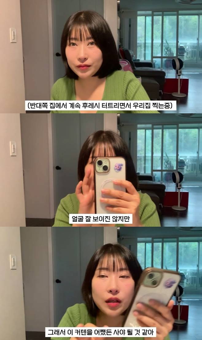 잠시 촬영을 중단한 이세영은 "무서운데? 지금 너무 좀 무섭다"며 "촬영 중에 앞집에서 갑자기 여기를 찍고 있어서, 여기 창문에다가 커텐을 달아야 할 것 같다"고 불안감을 표출했다.