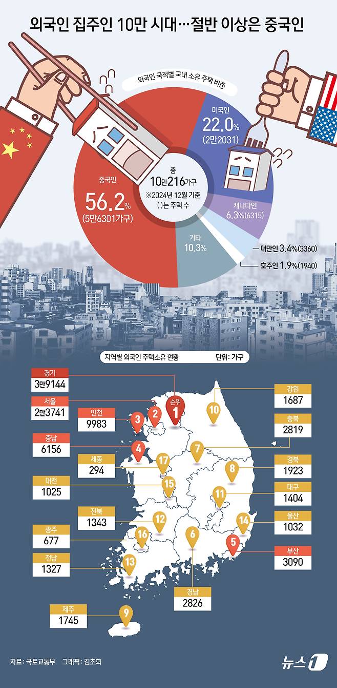 (서울=뉴스1) 김초희 디자이너 = 30일 국토교통부가 발표한 '2024년 말 기준 외국인 토지주택 보유통계'에 따르면 외국인 9만 8581명이 총 10만 216가구를 소유한 것으로 나타났다. 이는 전체 주택(1931가구)의 0.52% 수준이다. 국적별 비중은 중국(56.0%), 미국(21.9%), 캐나다(6.3%) 등으로 나타났고, 지역별로는 경기(39.1%), 서울(23.7%), 인천(10.0%) 등으로 나타났다.