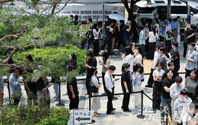(서울=뉴스1) 오대일 기자 = 제21대 대통령 선거 사전 투표 둘째 날인 30일 오후 서울 강남구 역삼1동 주민센터에 마련된 사전투표소에서 점심시간을 이용해 투표소를 찾은 유권자들이 손선풍기와 양산으로 더위를 피하며 길게 줄을 늘어서 있다. 2025.5.30/뉴스1