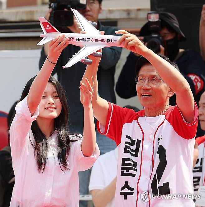 (충주=연합뉴스) 박동주 기자 = 국민의힘 김문수 대선 후보가 30일 충북 충주시 젊음의 거리에서 열린 유세에서 '충주 항공물류 허브공항 유치' 라고 적힌 비행기 모형을 받고 있다. 2025.5.30
