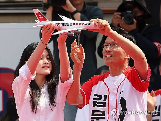 (충주=연합뉴스) 박동주 기자 = 국민의힘 김문수 대선 후보가 30일 충북 충주시 젊음의 거리에서 열린 유세에서 '충주 항공물류 허브공항 유치' 라고 적힌 비행기 모형을 받고 있다. 2025.5.30