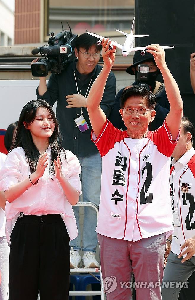 (충주=연합뉴스) 박동주 기자 = 국민의힘 김문수 대선 후보가 30일 충북 충주시 젊음의 거리에서 열린 유세에서 '충주 항공물류 허브공항 유치' 라고 적힌 비행기 모형을 받고 있다. 2025.5.30