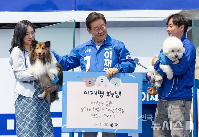 [춘천=뉴시스] 조성우 기자 = 이재명 더불어민주당 대선후보가 30일 오후 강원 춘천시 춘천역 광장에서 열린 집중유세에서 반려견 토리, 뭉치와 함께 기념촬영을 하고 있다. (공동취재) 2025.05.30. photo@newsis.com