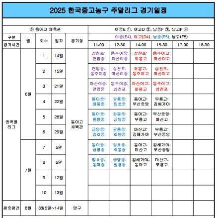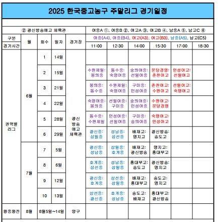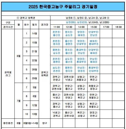 한국중고농구연맹(회장 박소흠)은 30일 '2025 한국중고농구 주말리그 권역별 대회' 대진표 추첨과 경기 일정을 알렸다.