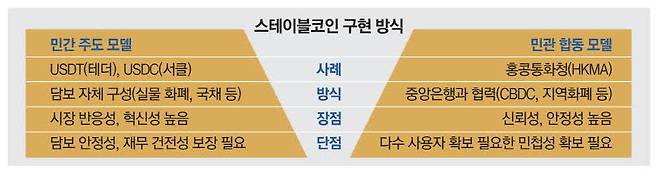 민간 주도 모델은 기존 핀테크 기업이나 블록체인 기술 기업이 원화를 담보로 자체적으로 스테이블코인을 발행하는 방식이다. 테더, 서클도 모두 이 같은 방식으로 USDT, USDC를 발행한다. 시장 상황에 기민하게 대응할 수 있고 혁신적인 서비스를 내놓을 가능성이 높지만 신뢰성과 안정성 확보가 관건이다.
