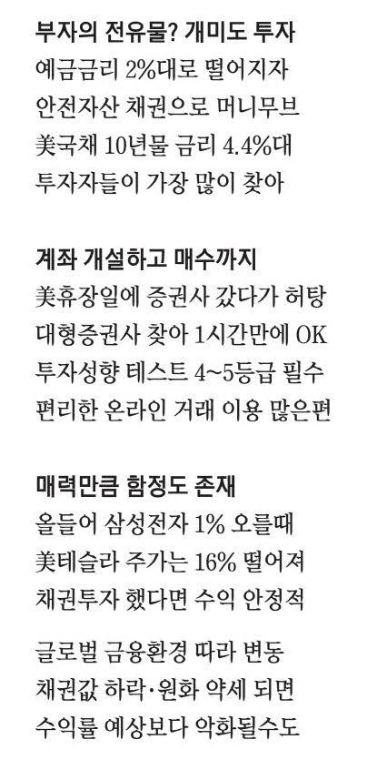 '100달러로 연 4.38% 이자를 주는 미국 채권 매수 완료.' 지난 5월 27일 서울 삼성동에 위치한 삼성증권 파르나스금융센터WM지점을 방문한 이후 1시간 만에 이를 달성했다. 이 같은 채권 매수는 최근 대세다. 특히 금리가 높은 미국 국채가 인기다. 거래가 활발한 10년짜리 채권 금리는 최근 4.4%대, 30년물은 5%를 찍었다. 국내 예금 금리의 2배 수준이다. 예민한 투자자들이 이를 놓칠 리 없다.