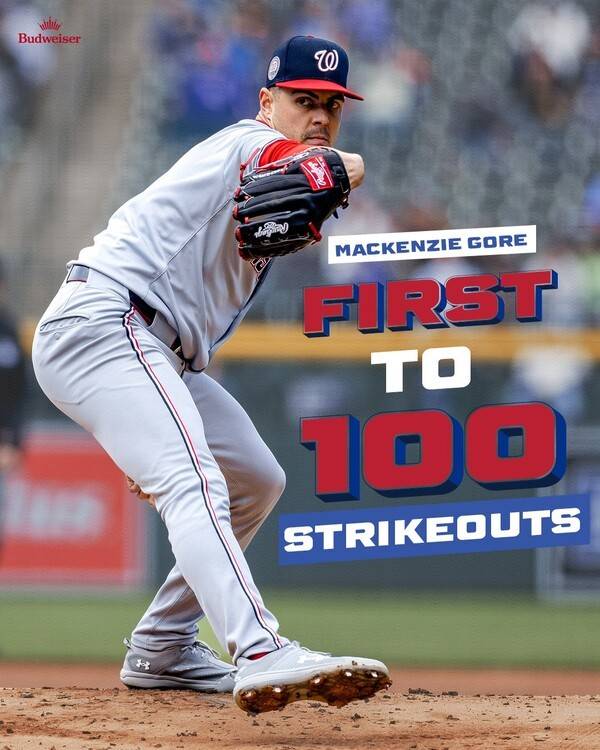 [SPORTALKOREA] 한휘 기자= 2025시즌 메이저리그(MLB) '1호' 100탈삼진의 주인공은 워싱턴 내셔널스의 '좌완 에이스' 맥켄지 고어다.