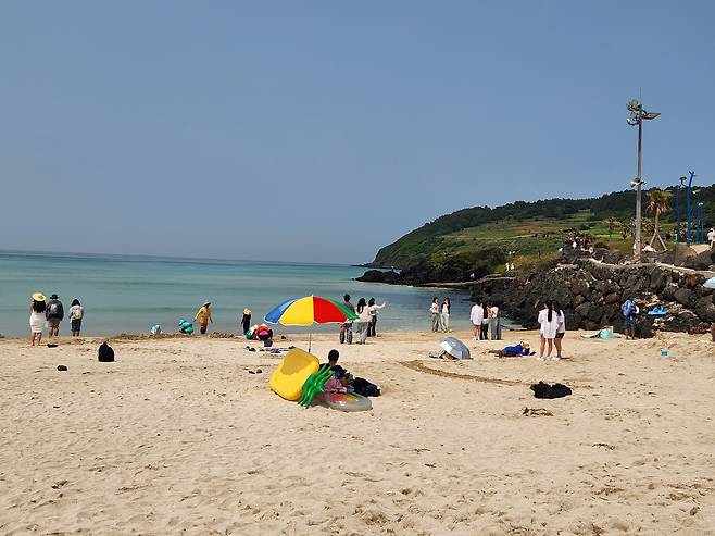 "날씨도 좋고 비도 안 와서 해수욕하기도 좋고. 저희는 저기 다른 데서 벌써 스노클링하고 와 가지고."