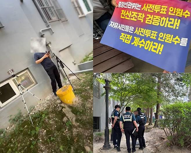 | ▲ 29일 대전 서구 갈마동 갈마아파트 관리사무소 사전투표소 인근에서 5-6명의 성명불상의 사람들이 투표하는 유권자들을 불법 촬영하는 드 선거를 방해하는 일이 벌어져 경찰이 강제 해산시켰다. 사진은 촬영하는 사람(왼쪽)과 이들이 들고 있던 피켓(오른쪽 위), 경찰이 출동해 강제 해산시키는 장면(민주당대전시당 제공). |