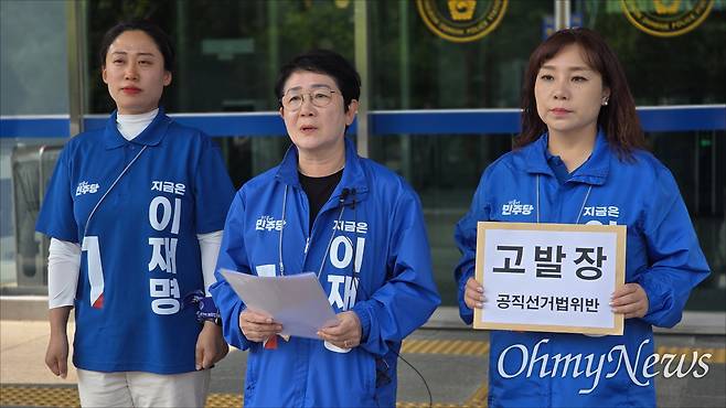 | ▲ 민주당대전시당은 지난 29일 대전 서구 갈마동 갈마아파트 사전선거 투표소 인근에서 투표를 하는 유권자들의 선거를 방해한 성명불상의 사람들을 30일 대전둔산경찰서에 고발했다. 사진은 왼쪽 부터 서다운 대전서구의원, 박정현 대전시당위원장, 김민숙 대전시의원. |