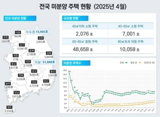 이같은 악성 미분양은 수도권보다는 지방을 중심으로 늘었다. 수도권의 준공 후 미분양은 4,525가구로 전월(4,574가구) 대비 소폭 줄어든 반면, 비수도권은 2만1,897가구로 전월 대비 1,354가구 늘었다. 4월 전체 미분양 주택은 6만7,793가구로 전월 대비 1.6% 감소했다.
