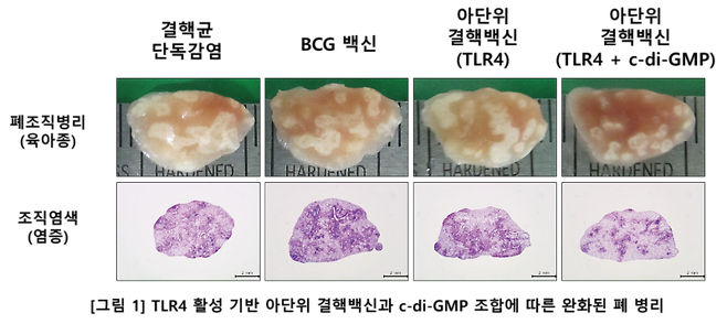 동물 모델을 활용한 결핵 백신 효능을 평가하기 위해 연세대 의과대학의 생물안전3등급 동물시설에서 백신을 접종한 후 고병원성 임상 결핵균을 생쥐에 공기 감염시켰다. 매우 흥미롭게도 BCG 백신과 TLR4 면역증강제 기반 아단위 결핵 백신과 비교해 TLR4 면역증강제와 c-di-GMP가 함께 포함된 아단위 결핵 백신 그룹에서 완화된 폐 염증이 관찰됐다(그림 1).