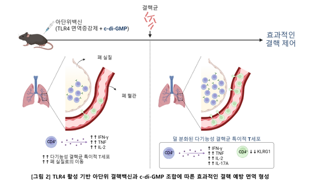 연구진은 "이번 연구는 c-di-GMP와 TLR4 면역증강제를 조합함으로써 결핵을 효과적으로 제어할 수 있는 차세대 결핵 백신 개발 가능성을 시사하고, c-di-GMP 사용에 따른 장기적 보호 효능과 관련된 면역 관련 표지인자인 폐 실질에서의 다기능성 결핵균 특이적 T세포 반응과 T세포 기능소진 극복은 향후 결핵 예방의 핵심 메커니즘을 이행하는데 중요한 연구결과로 의미가 있다"고 말했다.