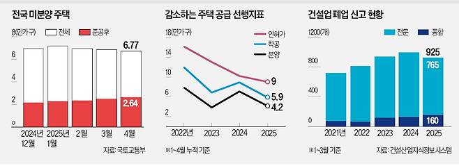 ‘악성 미분양’으로 불리는 준공 후 미분양 아파트가 쌓이면서 전국 곳곳에서 곡소리가 나오고 있다. 건설사들의 대규모 할인에도 미분양이 해소될 기미는 보이지 않고 있다. 중도금, 잔금 등을 제때 못 받은 중소 건설사·시행사의 연쇄 부도 우려가 확산하고 있다.