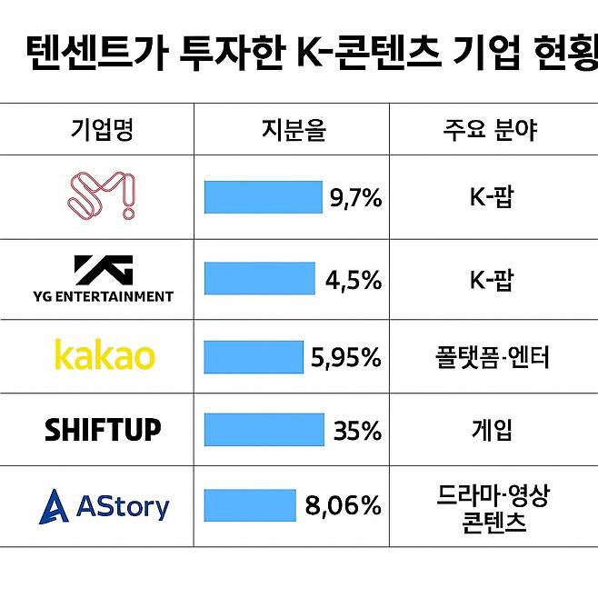텐센트는 2016년 카카오와 YG엔터테인먼트에 대한 투자를 시작으로 드라마 제작사 에이스토리(Astory)와 국내 게임사 시프트업의 지분을 확보하며 국내 콘텐츠 시장에 공격적인 투자를 단행하고 있다.