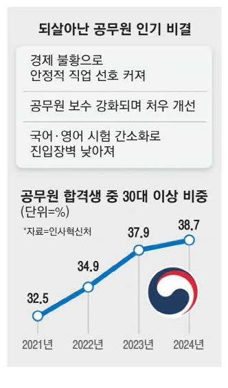 그러다 보니 30대 이상 공시생과 합격자가 늘어나는 추세도 관찰된다. 연령대별 합격생 비율을 보면 2021년 32.5%였던 30대 이상 공무원시험 합격자 비중은 매년 늘어나 지난해에는 38.7%를 차지했다. 특히 36세 이상 합격자도 12%에 달했다.