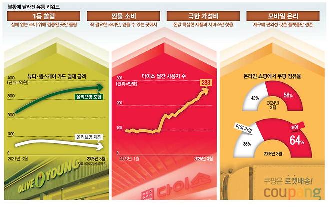 업계 관계자는 "경기 침체가 길어지면서 이커머스에 익숙한 3040 주력 이용층은 물론 소비 여력에 더 큰 충격을 받는 젊은 층과 고령층에서도 일제히 쿠팡·올리브영·다이소 등 각 분야별로 소비 채널을 단일화하는 경향이 뚜렷해지고 있다"고 했다.