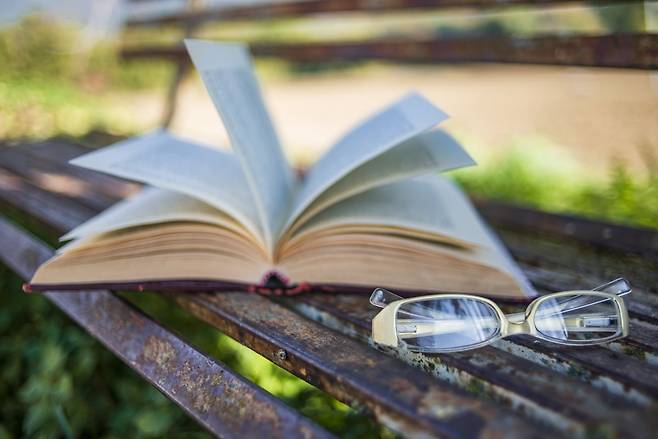 낯선 도시 공원에 앉아 책 읽는 여유