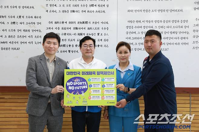 대한체육회가 진천국가대표선수촌을 방문한 박찬대 더불어민주당 원내대표와 '우생순 레전드' 임오경 의원(문체위 간사, 중앙선대위 직능본부 수석부본부장)에게 '대한민국 미래체육 정책제안서'를 전달했다.