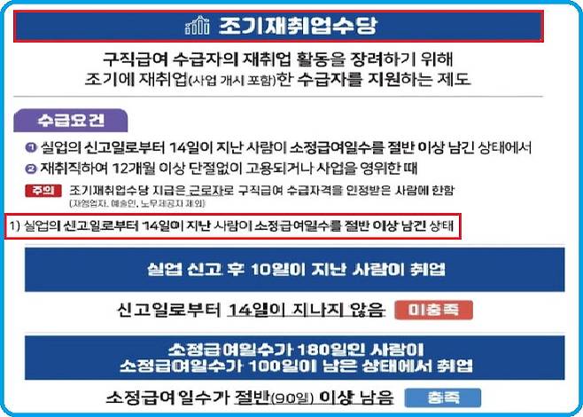 조기재취업 수당을 받을 수 있는 경우는 다음 두 가지 요건을 충족해야 한다. 우선 재취업한 날의 전날을 기준으로 구직급여일수가 1/2 이상 남아 있어야 하고, 12개월 이상 계속해서 고용 또는 사업을 영위해야 한다. 여기에는 사업주가 변경되더라도 기간의 단절 없이 계속 고용되어 12개월 이상 근무한 경우와 일용근무자로 재취업한 경우에도 재취업한 날로부터 10일 이상 일용 근로한 달이 12개월 이상 되는 경우도 포함한다. 조기재취업 수당은 재취업한 날 또는 사업을 시작한 날로부터 12개월이 경과한 날로부터 3년 이내에 관할 고용센터에 청구하면 된다.