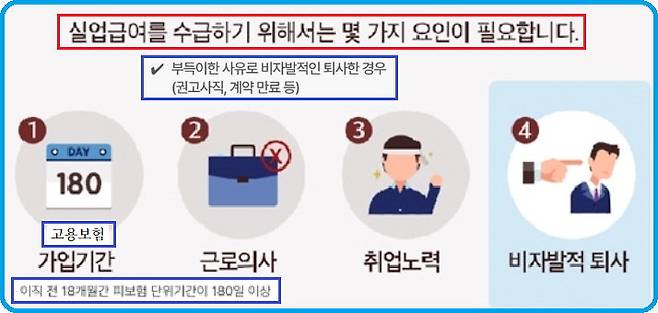 실업급여를 받기 위해서는 권고사직, 계약기간 만료, 정리해고 등 비자발적인 사유로 퇴직해야 한다. 정년이 도래하거나 계약기간이 만료되어 회사를 다닐 수 없게 된 경우에도 비자발적인 퇴직으로 본다. 하지만 개인사정으로 퇴직하는 경우와 본인 귀책사유로 퇴직하는 경우에는 구직급여를 받을 수 없다. 자발적인 퇴사라 하더라도 사업주의 사정으로 더 이상 근무하는 것이 곤란한 경우에는 불가피성을 인정받아 구직급여를 지급 받을 수 있다. 예외적으로 수급자격이 인정되는 경우는 직장 내 괴롭힘을 당했거나, 임금이 2개월 이상 체불되었거나, 임신. 출산. 육아 등으로 일할 수 없는 경우다.