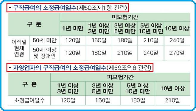 구직급여 지급일수는 퇴직 당시 고용보험 가입기간과 연령에 따라 120일에서 270일 범위에서 산정된다. 퇴직당시 고용보험 가입기간이 1년 미만인 경우에는 나이와 상관없이 120일 범위에서 구직급여를 신청할 수 있다. 고용보험 가입기간이 1년 이상인 경우에는 나이에 따라 신청가능기간이 차이가 난다. 고용보험 가입기간이 10년 이상인 경우 50세 미만인 자는 240일, 50세 이상이거나 장애인은 270일 동안 구직급여를 수령할 수 있다.