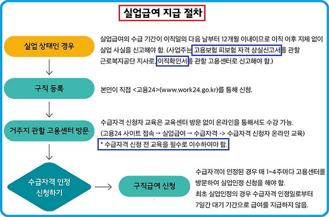 구직급여를 수령하기 위해서는 고용24 홈페이지에서 구직신청을 하는 것이 필수다. 정부는 실업자가 이곳에서 구직신청을 해야 구직의사가 있다고 판단하기 때문이다. 구직신청을 한 다음 개인정보가 포함된 이력서를 간단히 등록하면 신청이 완료된다. 실업자 본인이 ‘고용24 홈페이지’를 통해 구직을 등록하고, 수급자격 신청자 교육을 받아야 하는데 이는 거주지 관할 고용센터를 방문을 통할 수도 있지만 온라인을 통해서도 수강이 가능하다. 실업급여를 신청하려면 교육을 반드시 이수해야 한다. 해당교육은 ‘고용24 홈페이지’에서 제공한다. 다음으로는 ‘실업급여 수급자격신청서’를 제출하면 된다.