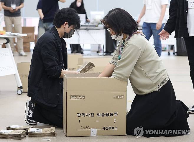 (서울=연합뉴스) 김도훈 기자 = 제21대 대통령선거 사전투표 둘째 날인 30일 서울 중구 을지누리센터에 마련된 사전투표소에서 사전투표사무원들이 관외투표용지 분류 및 발송 준비 작업을 하고 있다. 2025.5.30