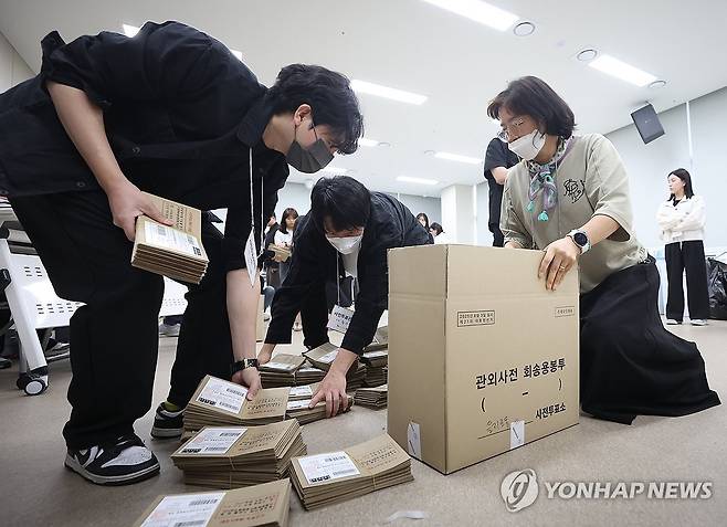 (서울=연합뉴스) 김도훈 기자 = 제21대 대통령선거 사전투표 둘째 날인 30일 서울 중구 을지누리센터에 마련된 사전투표소에서 사전투표사무원들이 관외투표용지 분류 및 발송 준비 작업을 하고 있다. 2025.5.30