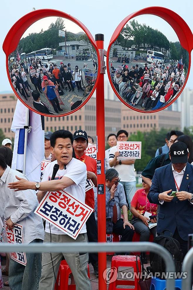 (과천=연합뉴스) 서대연 기자 = 전 한국사 강사 전한길 씨가 30일 경기도 과천시 중앙선거관리위원회 앞에서 열린 사전투표 폐지 및 공정선거 보장 촉구 집회에 참석하고 있다. 2025.5.30