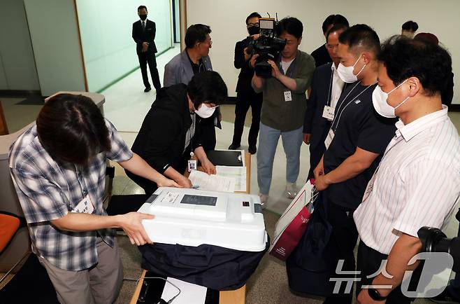 (서울=뉴스1) 김명섭 기자 = 제21대 대통령선거 사전투표일 마지막날인 30일 오후 서울 중구 중구선거관리위원회에서 선관위 관계자들이 관내 사전투표함을 보관소로 옮기고 있다. 2025.5.30/뉴스1
