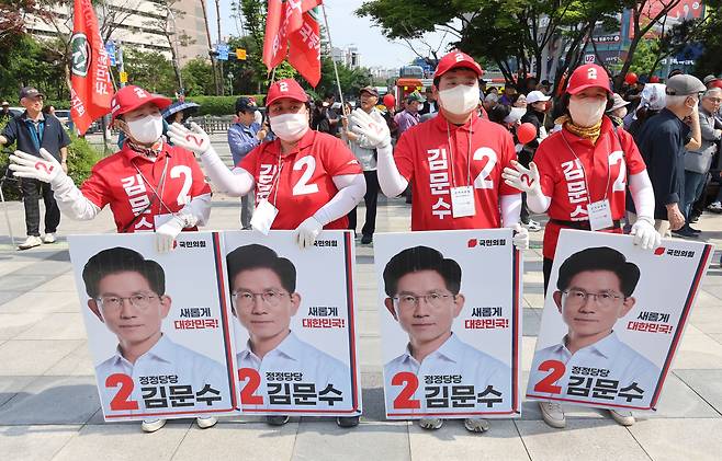 | ▲ 26일 오후 경기 용인 포은아트갤러리 광장에서 열린 김문수 국민의힘 대선 후보 “내일의 기적을 만들” 집중유세에서 선거운동원들이 유권자들에게 지지를 호소하고 있다. |