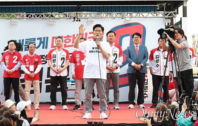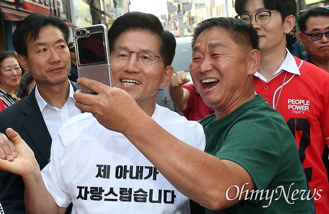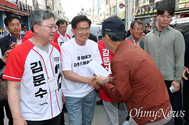 [오마이포토] '제 아내가 자랑스럽습니다' 티셔츠 입은 김문수 후보