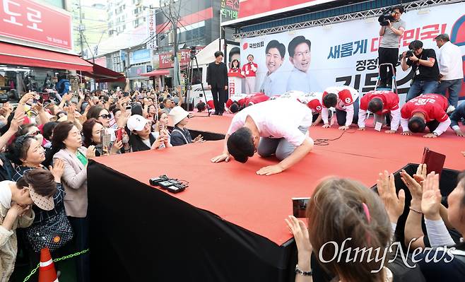 | ▲ 김문수 국민의힘 대선후보가 30일 오후 강원 원주시 문화의거리에서 열린 유세현장에서 시민들에게 큰 절을 하고 있다. |