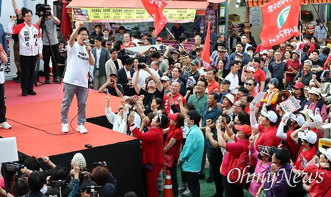 김문수 국민의힘 대선후보가 30일 오후 강원 원주시 문화의거리에서 '제 아내가 자랑스럽습니다'가 적힌 티셔츠를 입고 유세를 하고 있다.