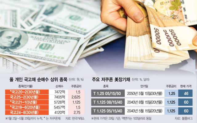 30일 금융투자 업계에 따르면 올 들어 29일까지 개인투자자들이 가장 많이 순매수한 국고채 종목은 ‘국고01500 - 5003(20-2)’이다. 2050년이 만기인 이 채권은 2020년 연 1.5% 금리로 발행된 전형적인 저쿠폰채로 개인은 7472억 원어치를 순매수했다. 국고01250 - 2603(21-1), 국고01125 - 3909(19-6) 등 표면금리가 연 1.25%, 연 1.125%인 종목들도 국고채 순매수 상위 종목에 올랐다. 서울 서초구 지점에 근무하는 한 프라이빗뱅커(PB)는 “고액 자산가의 90%는 저쿠폰 국채를 포트폴리오에 담고 있다”며 “최근 미국 장기채 가격이 약세를 보이고 있다 보니 오히려 저쿠폰 미국 장기채에 대한 관심이 늘어나는 추세”라고 말했다.