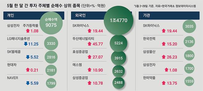 외국인 투자자의 순매수액 1위를 차지한 SK하이닉스는 5월 한 달 동안 주가상승률이 19.44%에 달했다.