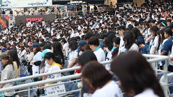 ▲ 한화이글스와 NC다이노스 경기에 앞서 구조물 낙하 사고 사망자에 대한 명복을 빌고 있는 팬과 야구 관계자들