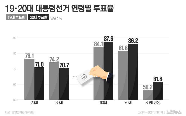 20대 대선 당시 2030 투표율은 19대에 비해 줄었던 반면, 60대 이상은 올랐다.