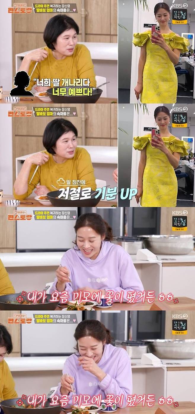 이보다 앞서 홈쇼핑으로 복귀한 장신영, 장신영의 어머니는 홈쇼핑에 나섰던 딸을 언급하며 "(지인들이) '너네 딸 완전 개나리다. 완전 예쁘다'라고 하더라"라고 전했다. 장신영은 이에 "내가 요즘 미모에 꽃이 피었거든"이라고 말해 웃음을 자아냈다.