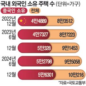 국적별로는 중국인이 보유한 주택이 5만6301가구(56.2%)로 가장 많았다. 전체 외국인 보유 주택에서 중국인 소유 비중은 2022년 말 53.8%에서 지속적으로 증가하고 있다. 작년 하반기에만 중국인 보유 주택이 3500가구 이상 늘었다. 이 기간 외국인이 사들인 주택 중 68%를 중국인이 사들였다.