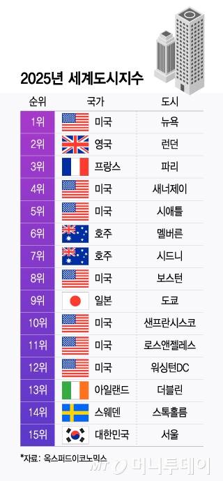 31일 영국 경제분석기관 옥스퍼드이코노믹스에 따르면 세계 1000개 도시에 대해 지난해 기준 경제, 인적자본, 삶의 질, 환경, 거버넌스 등 5개 항목을 평가한 '2025 세계도시지수(Global Cities Index)'에서 미국 뉴욕이 1위, 영국 런던이 2위, 프랑스 파리가 3위를 차지했다.