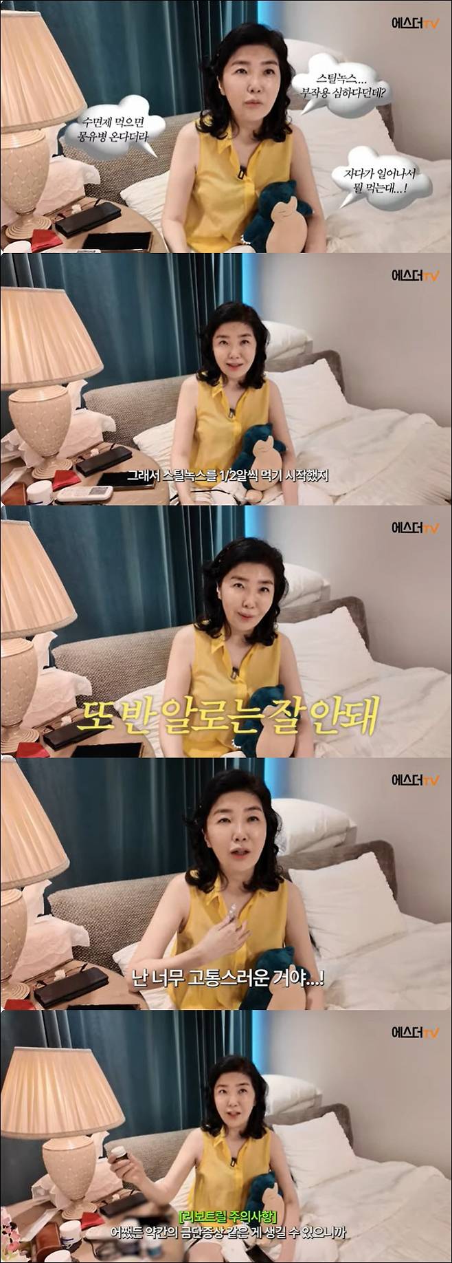 여에스더는 "근데 이 수면제를 검색하면 몽유병이 온다더라. 밤에 자다가 뭘 먹는다더라라는 등 온갖 부작용에 대한 얘기들이 있다. 근데 나는 필요하다고 생각한다. 내가 모든 노력을 들였음에도 못 자기 때문"이라며 "반 알씩 먹기 시작했는데 5~6년이 지나면서 반 알로 잘 안 된다. 그래서 1알씩 먹는다. 먹으면 4~5시간 유지된다 하는데 그건 컨디션이 좋을 때고 3시간 반이면 깬다"고 토로했다.