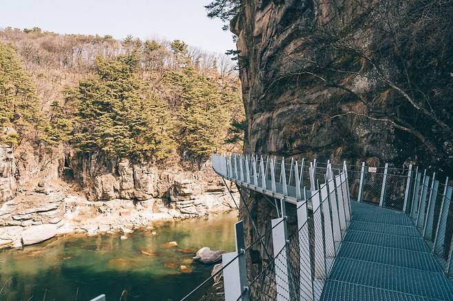 잔도길로 구성된 주상절리길을 따라 걷다 보면 철원한탄강 스카이전망대가 등장한다. 이곳이 주상절리길의 절반 지점이다. 스카이 전망대는 반원형 다리로 되어 있는데, 중간 지점부터는 바닥이 강화유리로 제작돼 있다. 유리 아래로 펼쳐진 한탄강의 옥빛 물줄기 위로 오리들이 유유히 헤엄치는 모습이 장관을 이룬다.