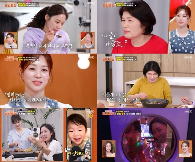 모녀는 함께 저녁을 먹으며 속이야기를 꺼냈다. 장신영은 3년 만에 일일드라마 주인공으로 복귀를 확정, 촬영에 매진 중이다. 친정엄마는 “주인공이라고 하니까 기분 좋더라”라고 말했다. 장신영은 “못 하면 또다시 기회가 없을 것 같으니까 부담감이 있다”라고 털어놨다.