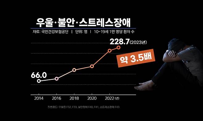 또한 우울증, 불안 장애, 스트레스 장애 등 3개 마음건강 질환의 증가세를 보면, 10~19세 인구 1만 명당 환자 수가 가파르게 늘어 10년 전에 비해 약 3.5배로 증가했습니다.