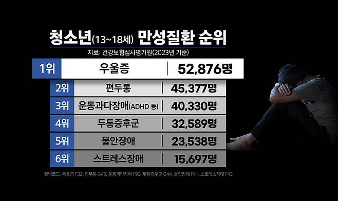 실제로 취재진이 지난 10년간 건강보험심사평가원과 국민건강보험공단의 자료를 분석학 결과, 청소년들이 겪는 만성질환 1위는 우울증이었습니다. 6위까지가 마음건강과 직결되거나 간접적인 영향을 받는 질환이 대부분인 것으로 나타났습니다.