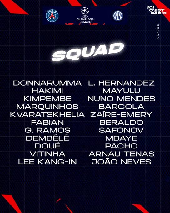 PSG는 30일(한국시간) 2024~25 UEFA 챔피언스리그(UCL) 결승전에 나설 22명의 선수 명단을 발표했다. 여기에는 이강인이 이름을 올렸다.