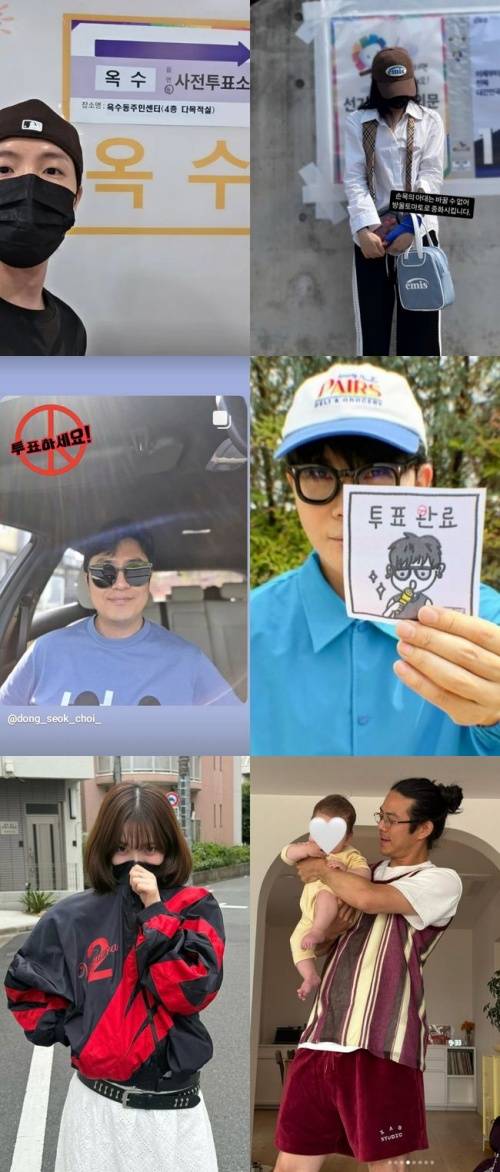 김고은은 사전 투표소 방향을 가리키는 안내문 사진으로 투표 사실을 알렸고, 조세호는 주민센터 사전투표소를 배경으로 특정 포즈 없이 인증샷을 찍었다. 얼마 전 재혼한 룰라의 이상민은 아내와 투표소를 갔고, 소유진도 사전 투표에 참여했으나, 어느 후보를 응원하는지 모르게 인증샷을 남겼다.