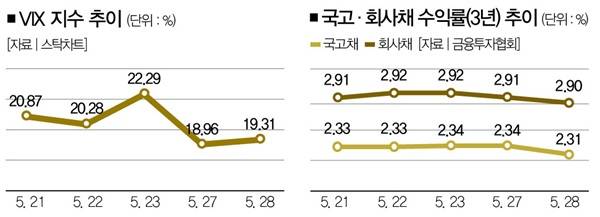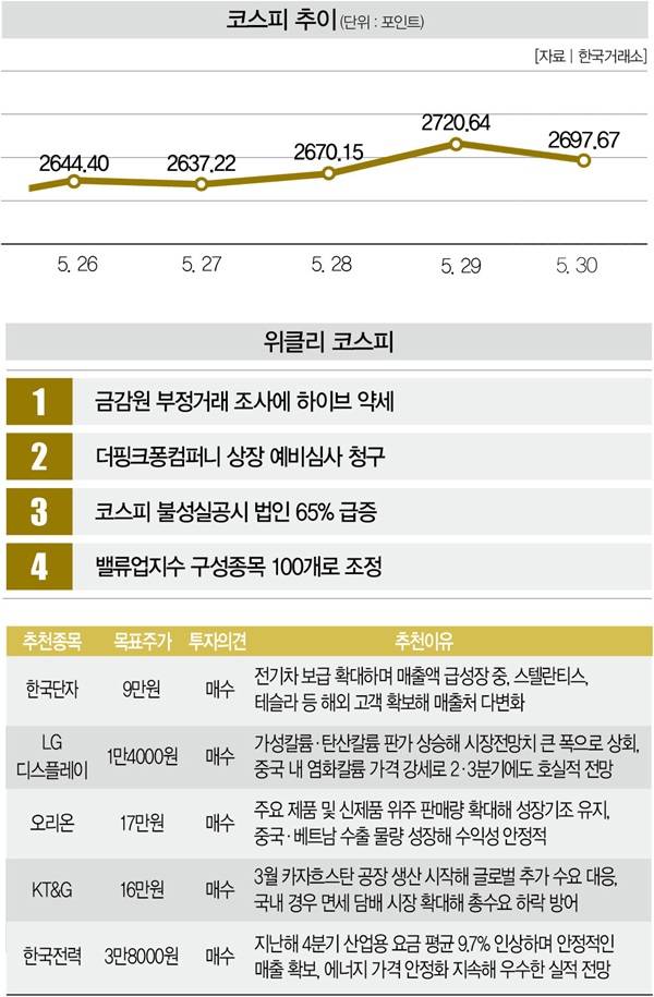 5월 23일 2592.09포인트를 기록하며 2600포인트대를 내줬던 코스피지수는 4거래일 만인 29일엔 2720.64포인트로 상승했다.